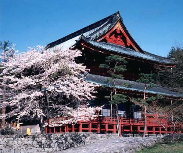木造建築、北関東最大の伽藍であり毎朝数十人の僧侶により勤行が行われ有名な強飯式や延年舞の古儀も内陣で行われる、四月中旬満開の桜が枝の先端まで花をつけ、春の盛りを謳歌する、堂内に身の丈8bの仏像三体が安置されてある。